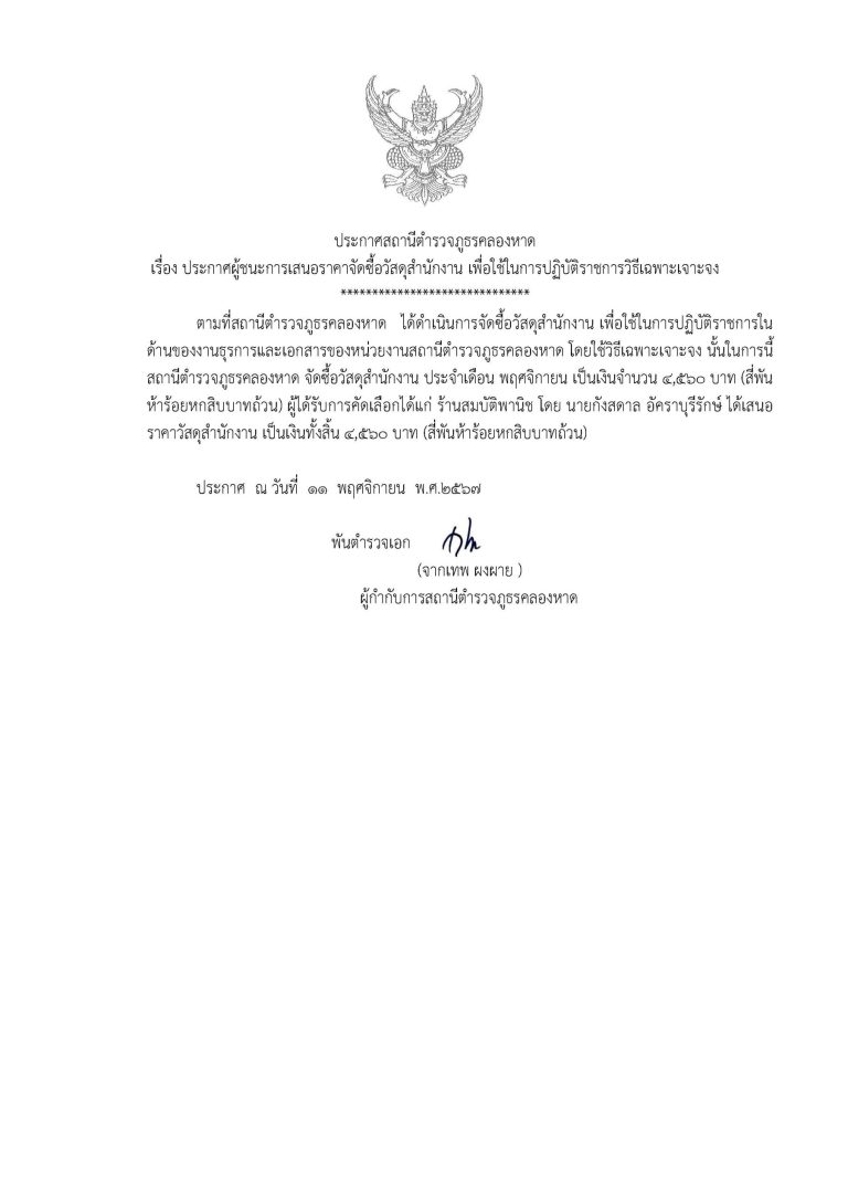 ประกาศจัดซื้อจัดจ้างวัสดุสำนักงาน สภ.คลองหาด พ.ย.67