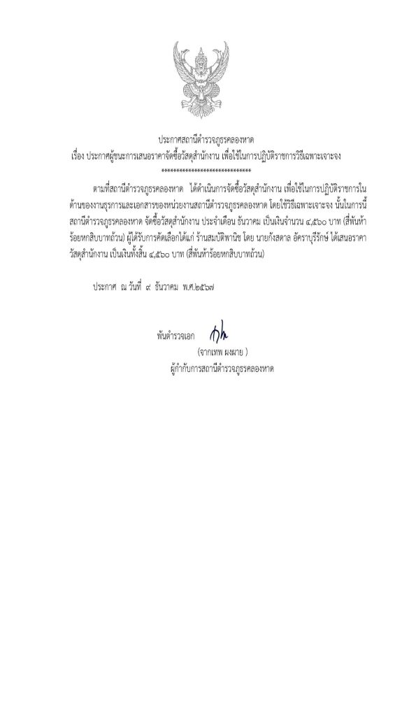 ประกาศจัดซื้อจัดจ้างวัสดุสำนักงาน สภ.คลองหาด ธ.ค.67