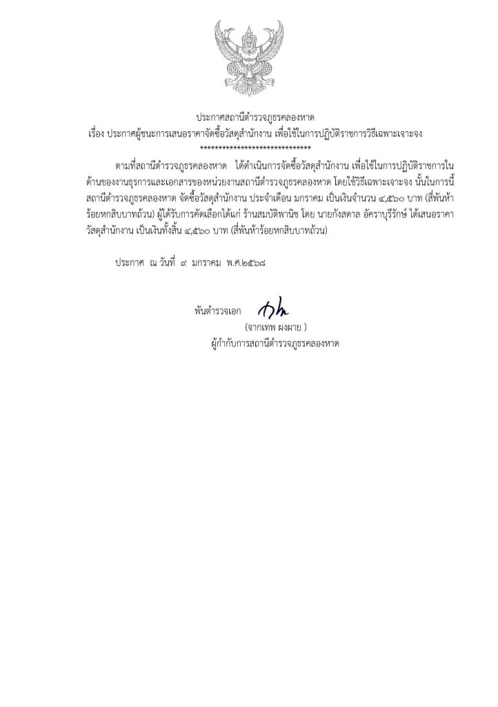 ประกาศจัดซื้อจัดจ้างวัสดุสำนักงาน สภ.คลองหาด ม.ค.68