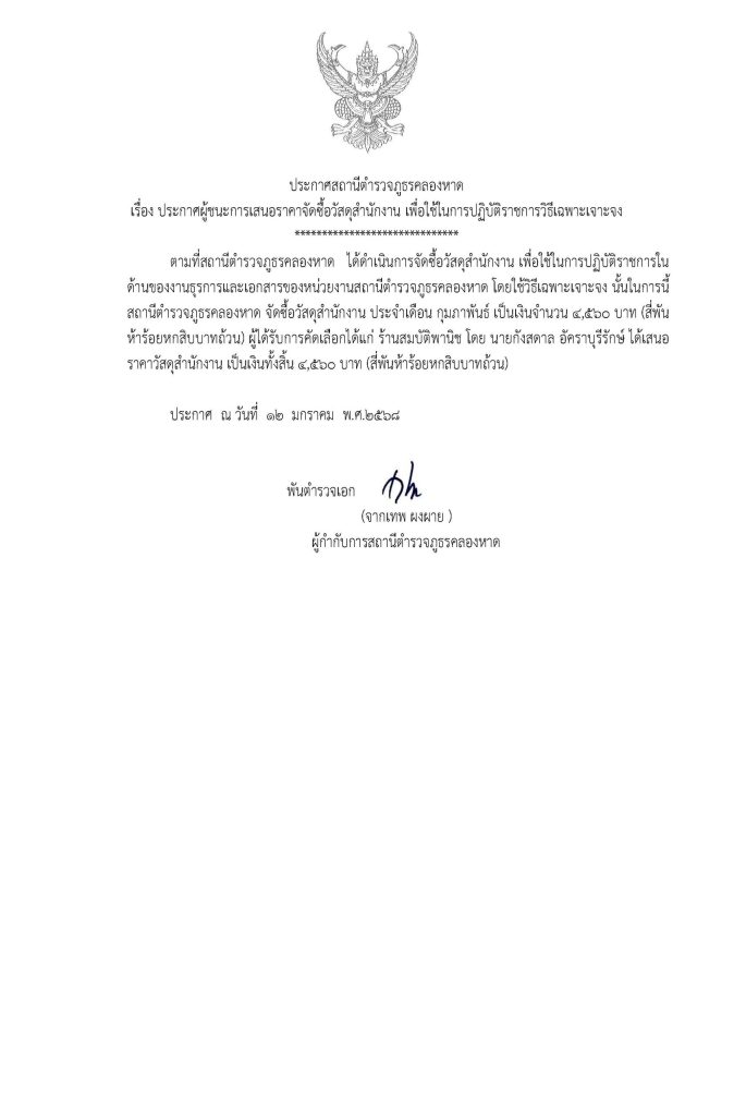 ประกาศจัดซื้อจัดจ้างวัสดุสำนักงาน สภ.คลองหาด ก.พ.68
