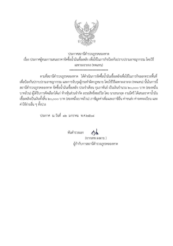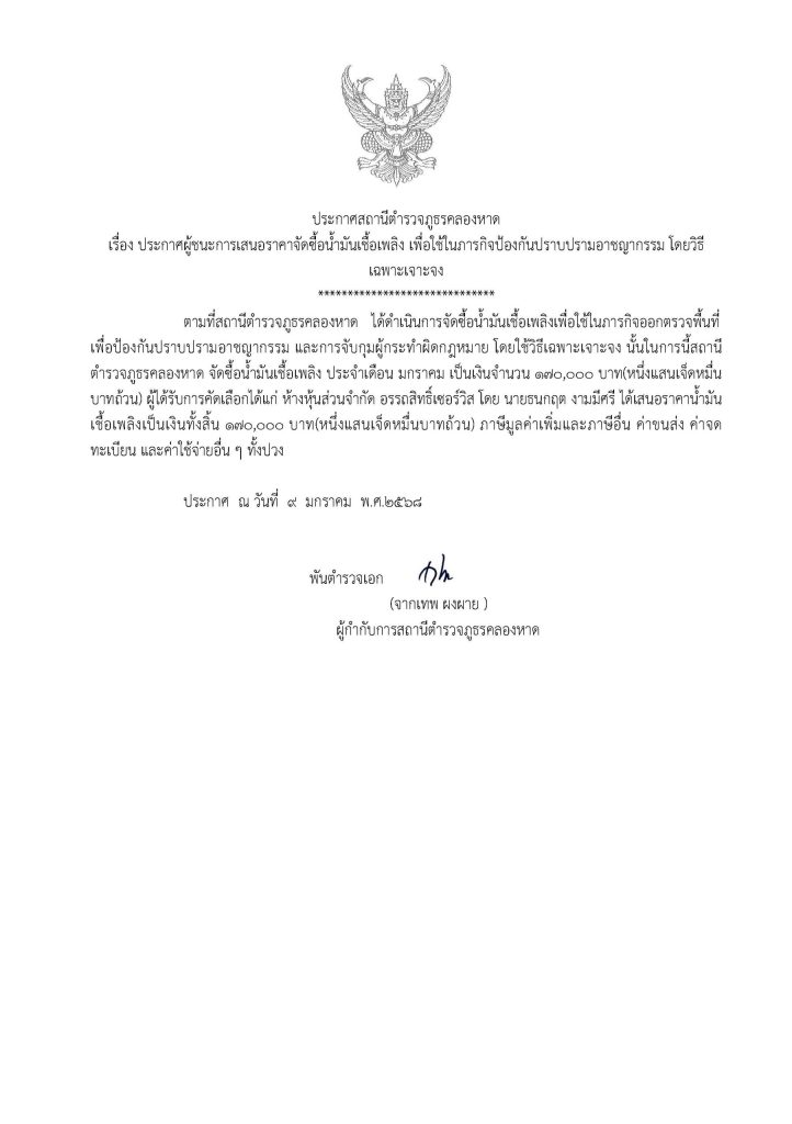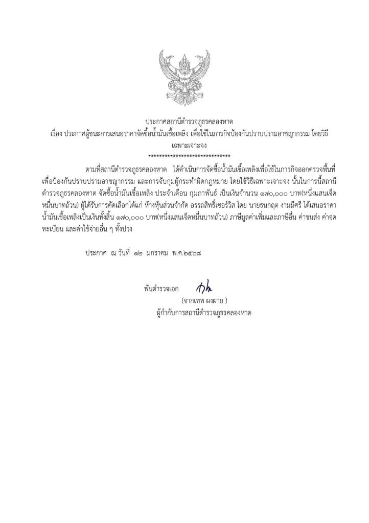 ประกาศจัดซื้อจัดจ้างน้ำมัน สภ.คลองหาด ม.ค.68