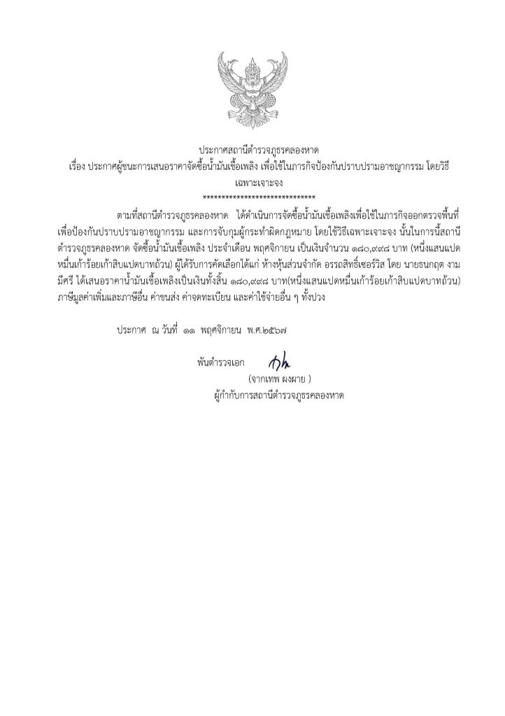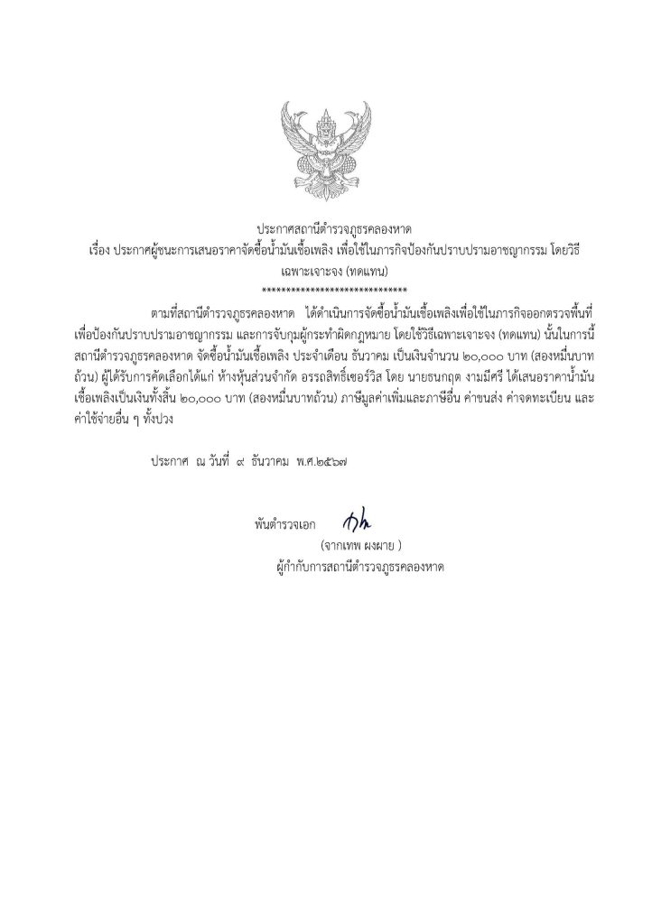 ประกาศจัดซื้อจัดจ้างน้ำมัน สภ.คลองหาด ธ.ค.67